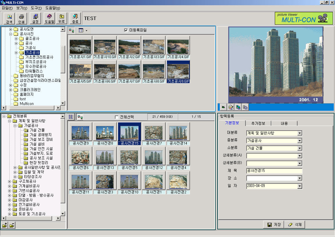 현장에서 발생하는 방대한 사진자료를 체계회된 통합관리기법을 적용하여 쉽게 관리하고 자료미리보기, 슬라이드 기능, CD 백업기능, 메일발송기능,